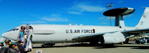 The AWACS airborne early-warning and command center, topped by its flying-saucer radome, concealing a radar reaching 300 miles in all directions.
