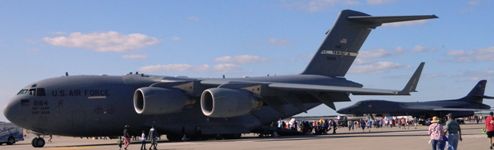 C-17 transport in foreground, supersonic B-1 Lancer bomber in background.