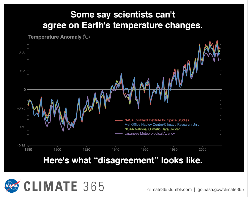 Agreement by multiple science agencies on Earth's temperature changes since 1880.