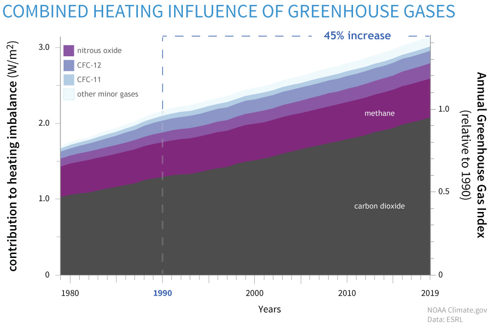 Note carefully: While the graph (in green bars) shows actual tons of carbon dioxide dumped into the atmosphere, the other colors show the carbon dioxide equivalent (in terms of their effect on climate temperature) of the other gasses -- not their actual amounts in the atmosphere. For instance, methane actually exists in the atmosphere in a tiny fraction of the amount of carbon dioxide. But methane is a FAR more potent "greenhouse" gas. So just a "sliver" of methane in the atmosphere has as much impact as a huge chunk of carbon dioxide. Hence, methane is shown as a big orange chunk -- its size based on scientific studies and calculations.