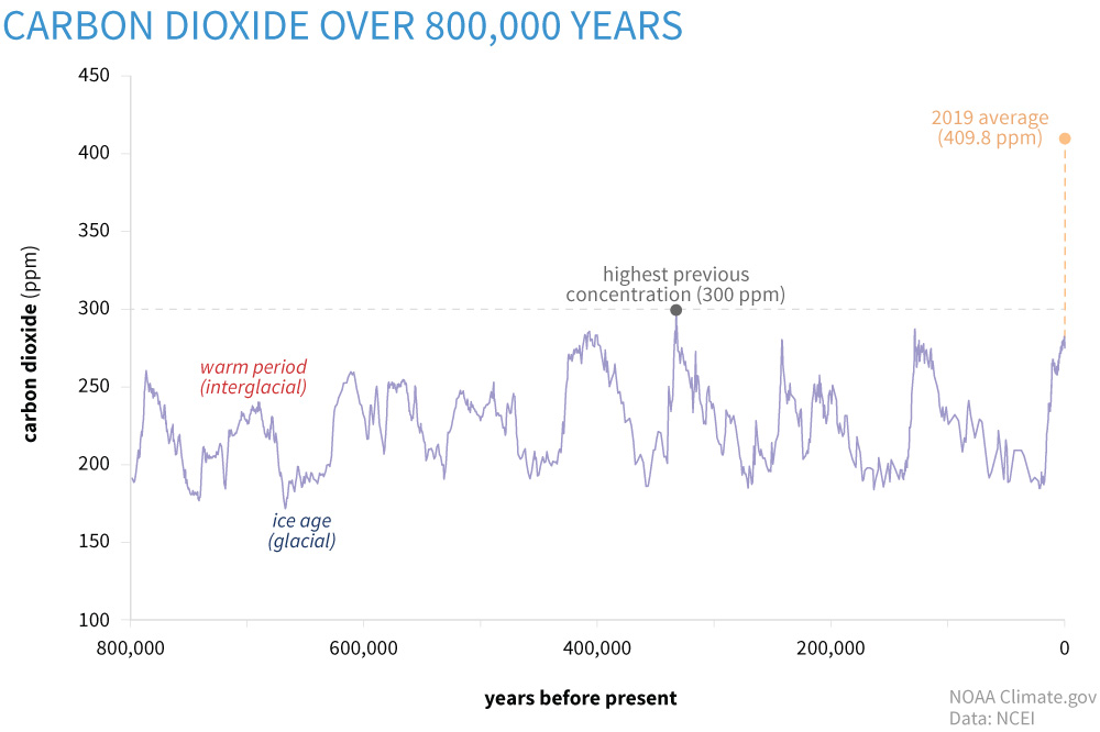 Notes (and graphs) the 800,000-year geologic/ice record of CO2 concentrations in the atmosphere (which have generally fluctated between 180 and 280 ppm) --