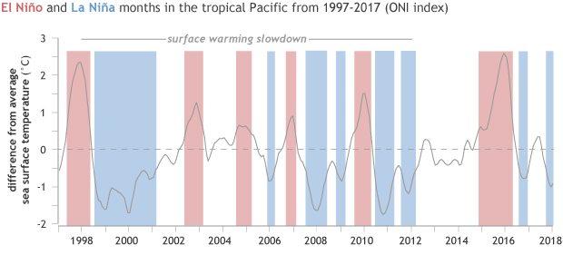 This article explains the unusual confluence of natural factors that slowed (but did not stop) the global temperature rise during 1998-2012. (It serves also as a helpful explanation for many of the short-term transient fluctuations in global temperature, throughout time). Some of the causes of the fluctuation are detailed below :