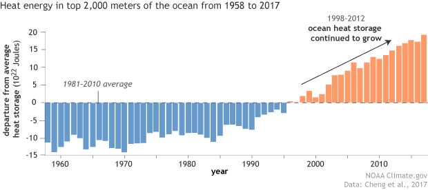 It also shows how -- although atmospheric temperature rise slowed from 1998 to 2012 -- the rising heat was, instead, largely being absorbed by the ocean (which, owing to far greater weight, can hold far more heat energy than the air).