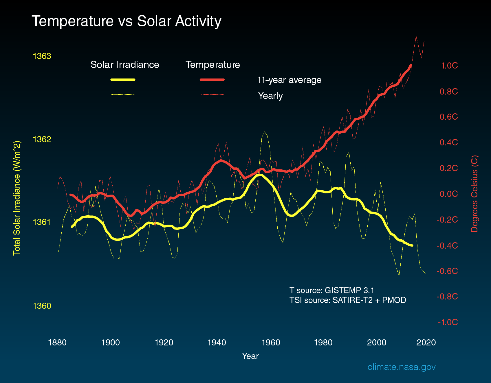 While some argue that solar energy is to blame for the global temperature rise, that is not the scientific record. Solar energy hitting the earth, which fluctuates on the sun's 11-year natural cycle, has (on average) remained fairly consistent, since 1880, and has recently even begun declining.