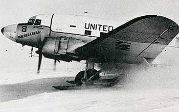 Many DC-3's were fitted with snow skis, or (very rarely) pontoon floats, to permit landing in unthinkable places (at right, in 1956, the first airplane landed at the South Pole -- an R4D 'Gooney Bird' on skis). The reliability of their wartime Pratt & Whitney engines made them safe to operate far from home. Able to land in short, rough strips that no other large, fast plane could handle, ordinary DC-3's showed up in South American and African jungles, Arab deserts, Asian valleys, Pacific islands, and Arctic tundras.