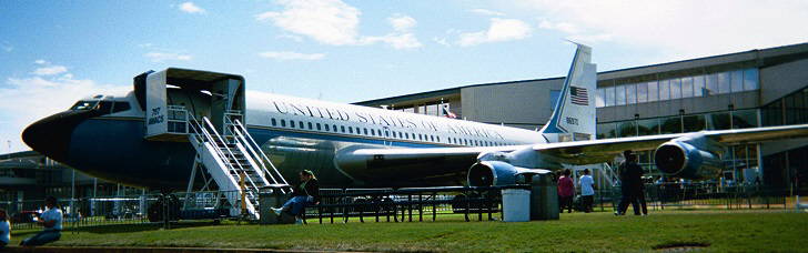 Out front, the Boeing VC-137 "Air Force One," invites visitors aboard the presidential "flying White House." A huge World War II Boeing B-29 Superfortress bomber keeps company with an F-14 Tomcat fighter (think: "Top Gun").