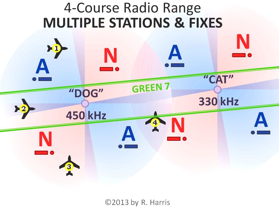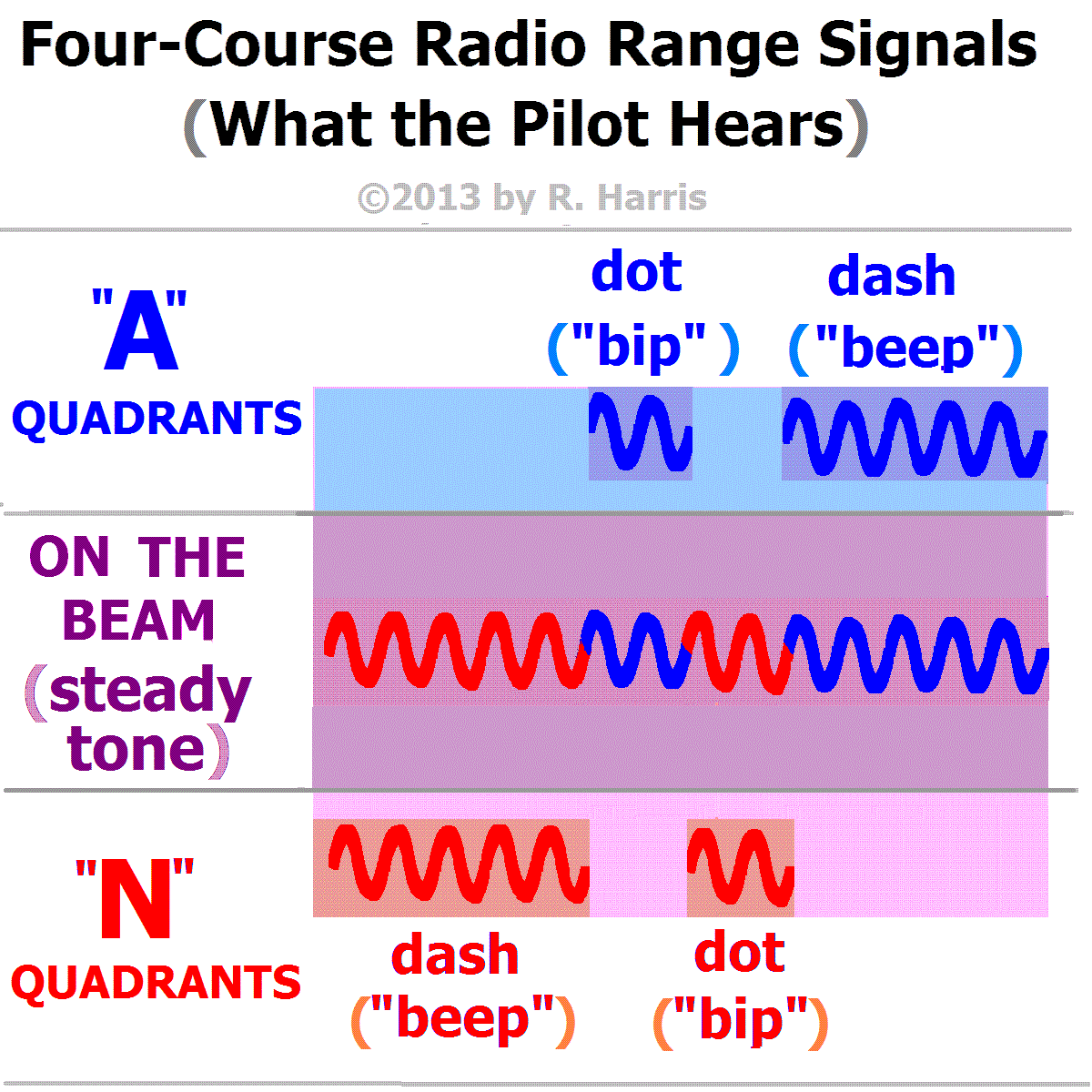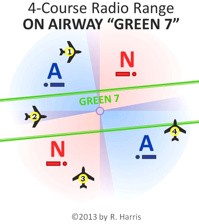 These "A" and "N" signals (which gave the radio ranges the common nickname "A-N ranges") were transmitted into slightly overlapping quadrants, around the station (see signal table, above-right, and map-view diagram, below-right).