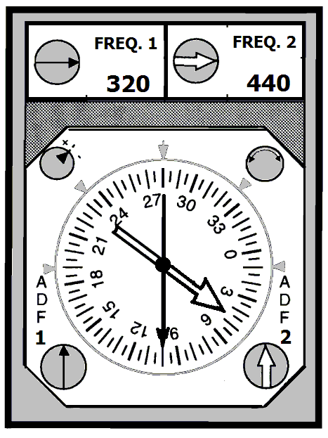 A dual-needle ADF indicator (right), simultaneously monitoring two separate ADF radios, could show both lines of position at the same time, clarifying where the pilot was between them. A single-needle ADF indicator and radio were enough, if used as a 2-needle indicator by manually alternating the radio tuning between two different stations. Both of these last two solutions required DF or ADF equipment. Some smaller craft only had simple radio receivers, without DF/ADF capability. 5.) Listen to OTHER 4-course ranges, as well. Each range operated on its own locally unique frequency. So other A-and-N signals, and beam hums, from other stations, could be heard by tuning in other radio ranges.