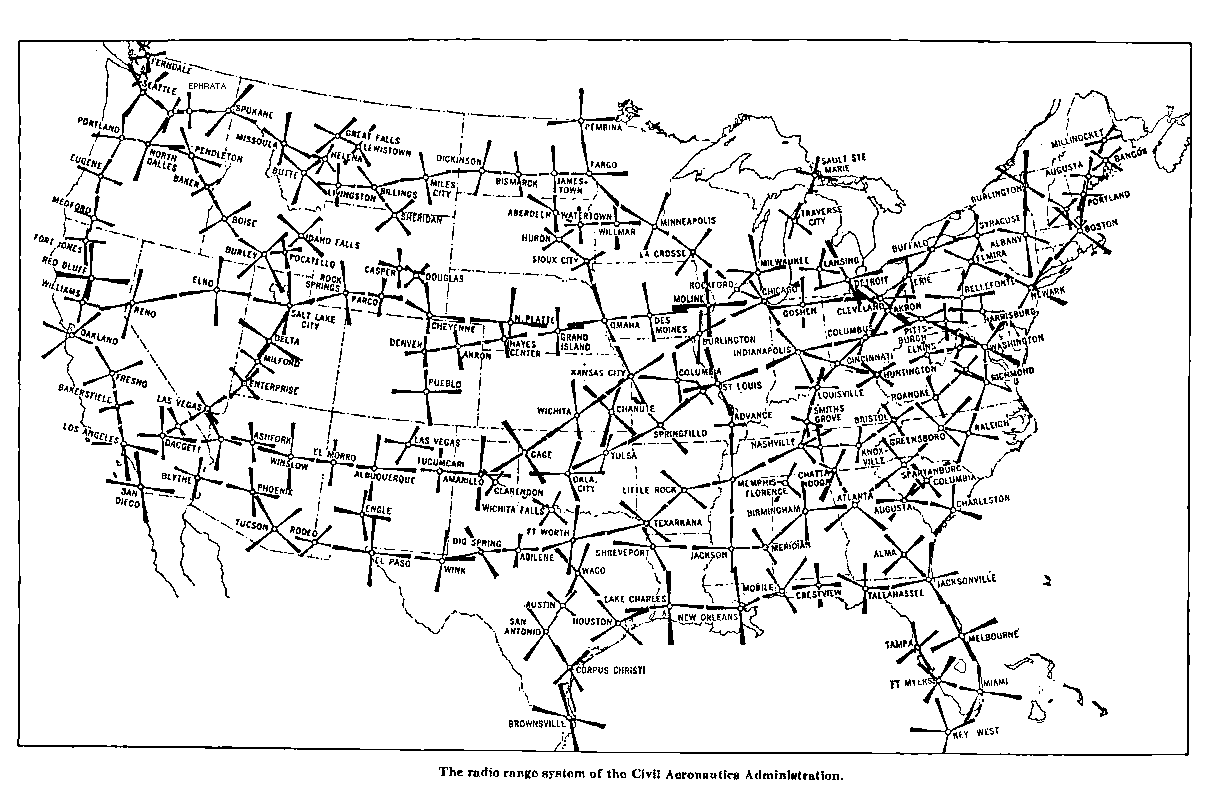 Initial efforts focused on simple radio beacons, broadcasting a simple Morse Code signal that could be "homed in on" using direction-finding ("DF") antennas. But these were of limited usefulness, and required pilots to have DF equipment, and know how to use it correctly. A simpler, clearer system was desired to ensure easy guidance for all aircraft — commercial, military and general aviation — using only a basic radio receiver. By the mid-1930s, the U.S. government established a network of aerial navigation radio towers across the nation, along well-traveled air routes — "airways." (Map below shows extent of system by the 1950s; click to enlarge.) A clever system was devised that allowed a pilot to navigate fairly precisely along a narrow "beam," using only a basic radio receiver to listen to simple sounds — through a speaker or headphones — for location and guidance clues.